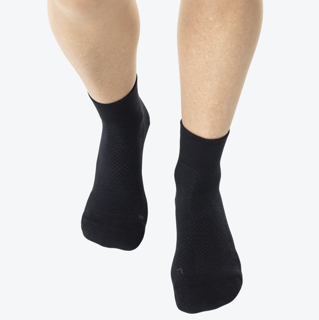 Sokken er lavet af blød økologisk bomuld og forstærket med mesh-paneler for øget ventilation, så dine fødder holder sig tørre og kølige hele dagen lang. Den 360-graders elastiske støtte sikrer, at sokken bliver på plads uden at klemme eller glide. Perfekt til dem, der ønsker at kombinere en barfodet følelse med ekstra stødabsorbering og støtte.